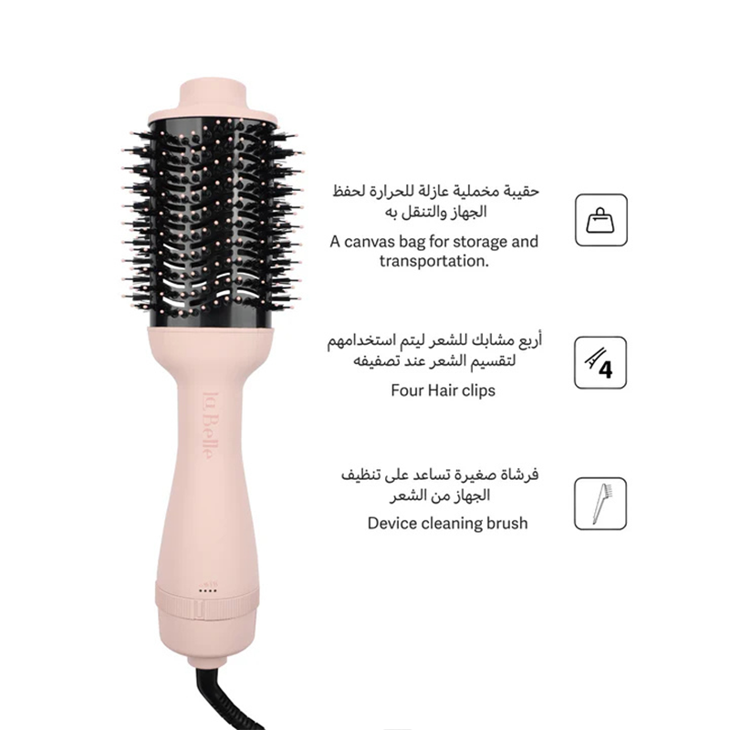 Description: Adorn your routine with the Feeluxe Hairbloom Brush in a charming pink hue, your secret to swift, silken hair. When moments matter most, this brush gently coaxes away frizz and knots. With three delicate heat settings, achieve smooth, styled perfection in under ten minutes, while enjoying its tangle-free glide and soothing scalp massage.