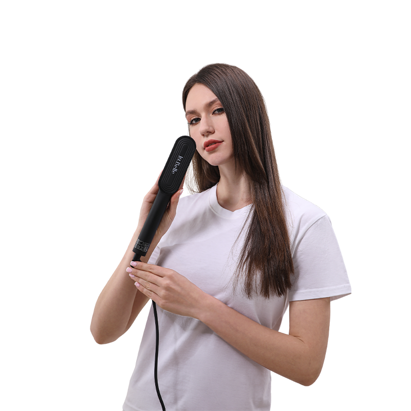 Description: Achieve touchably soft, straight hair with the Feeluxe Velvet Brush. This elegant black tool effortlessly smooths waves and curls with its gentle heat. The tourmaline-infused surface ensures even warmth, fighting frizz and imparting a luminous shine. Built-in teeth simplify styling. Style with poise, knowing our accessories and guarantee support you.